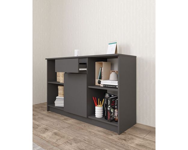 ТВ тумба с полками на полка держателях, створкой на накладных петлях и выдвижным ящиком на роликовых направляющих. На фасаде ящика отсутствуют ручки, функцию ручек выполняет сам фасад (его верхняя часть с внутренней стороны прямая под углом 90°). Открывание ящика производится за счет пространства между планками и фасадом.